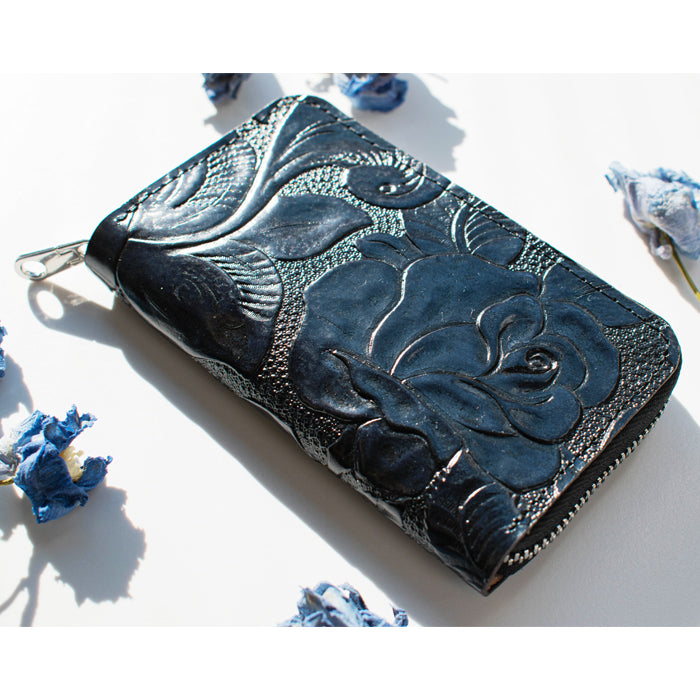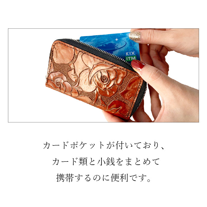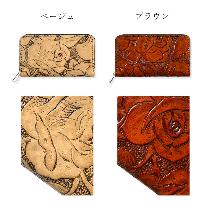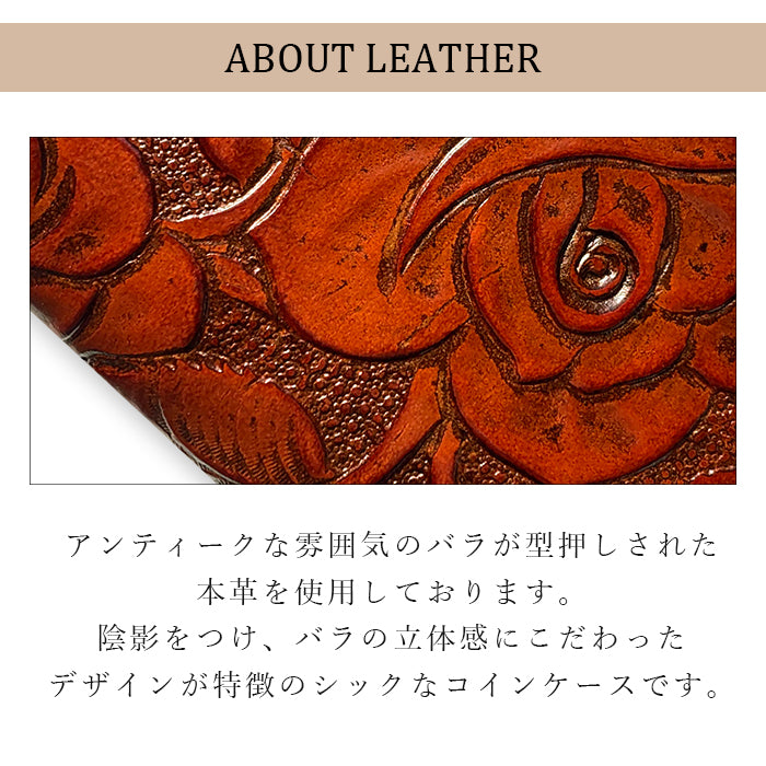 アンティークな雰囲気のバラが型押しされた本革を使用。