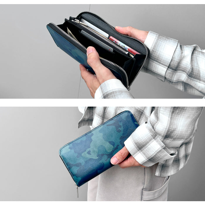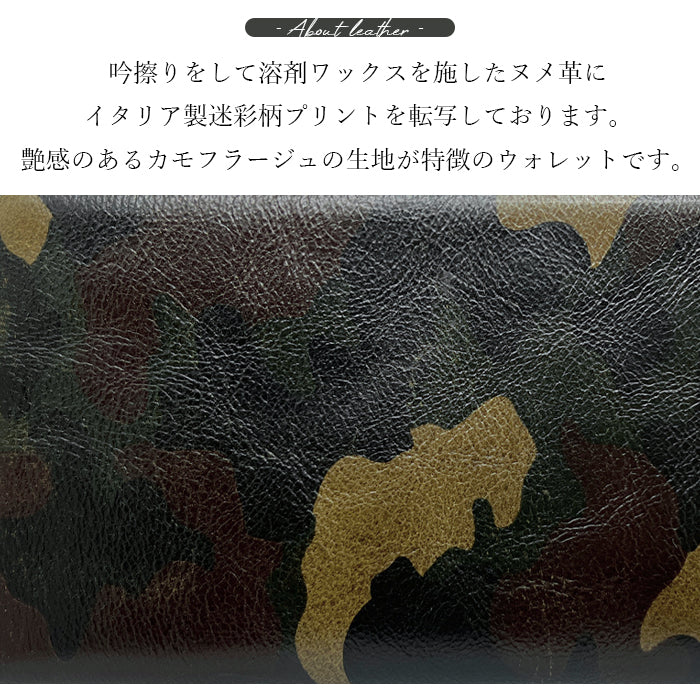 イタリア製迷彩柄プリントを転写したヌメ革を使用しております。