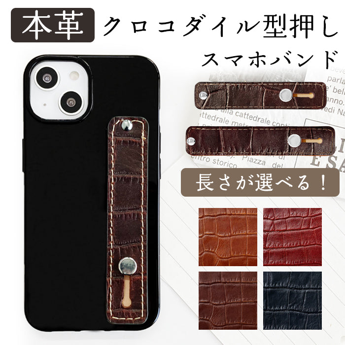 指を通して落下防止ベルトとしてお使い頂ける、本革のスマホバンドです。