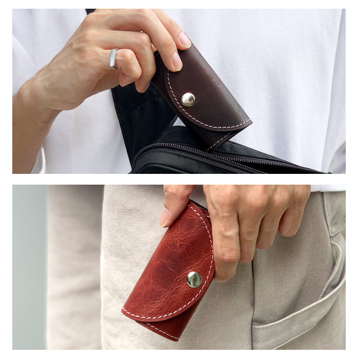 牛ヌメ革にワックスをかけ、絞り加工という技法で作製しております。