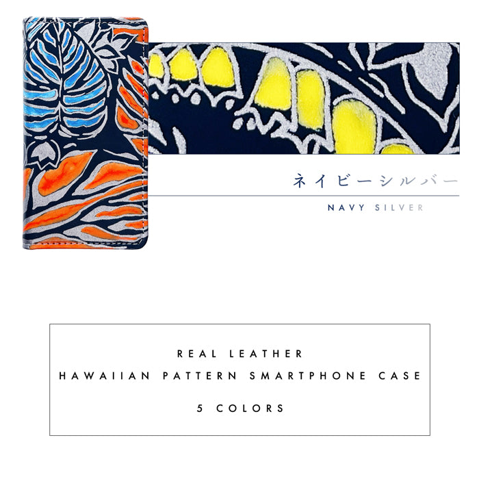 hawaiハワイの自然や文化にインスパイアされた、鮮やかなハワイアン柄の本革手帳型ケース。