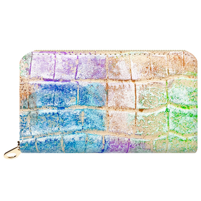 クロコダイルの型押しに顔料で色付けをしたカラフルで遊び心のある牛革を使用しております。