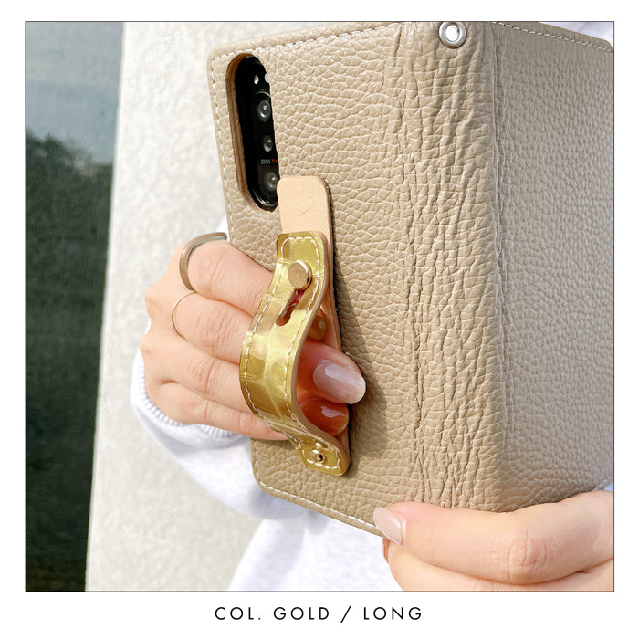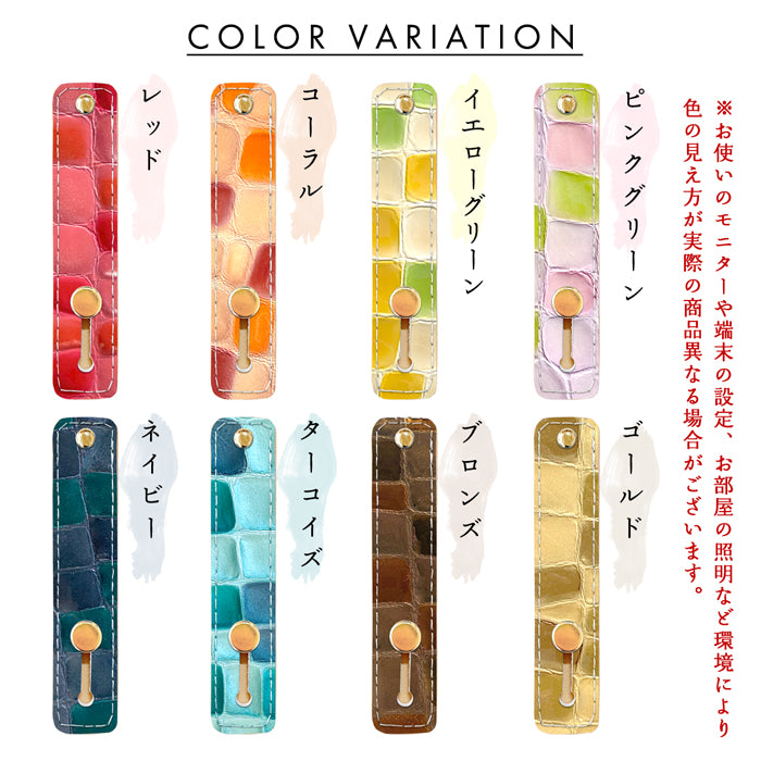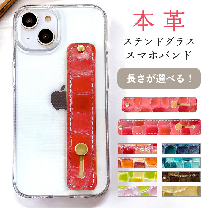 指を通して落下防止ベルトとしてお使い頂ける、本革スマホバンドです。