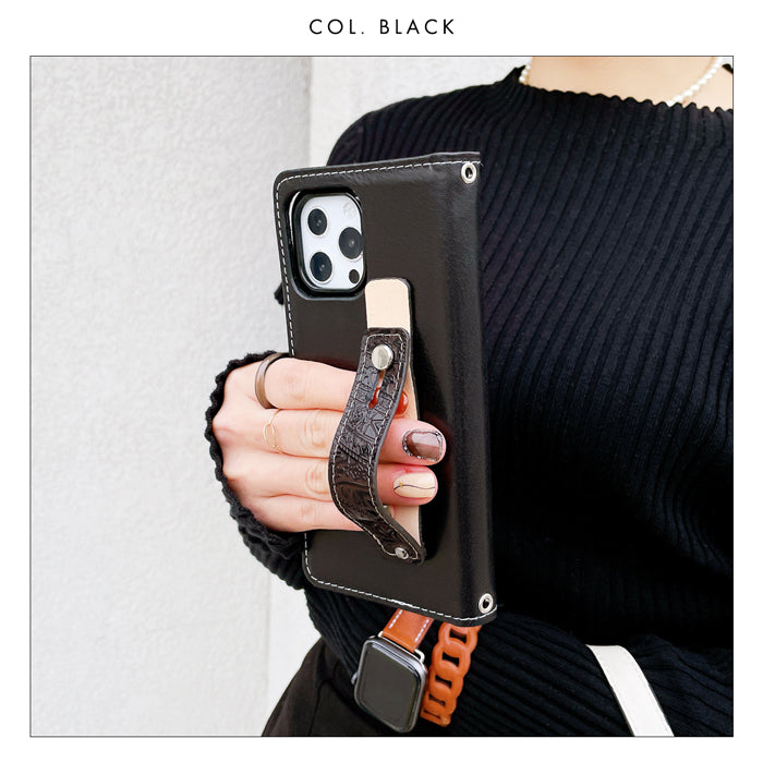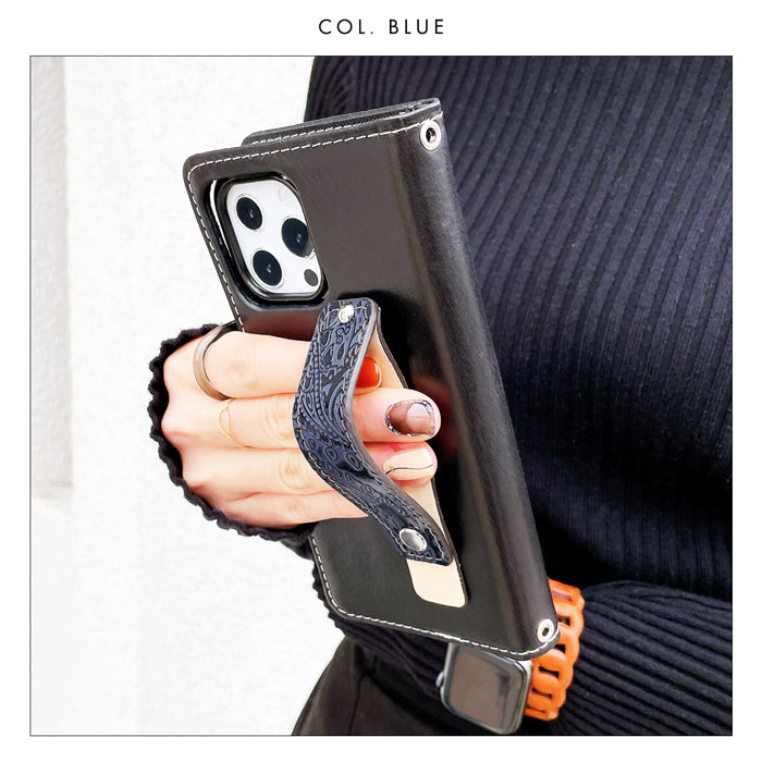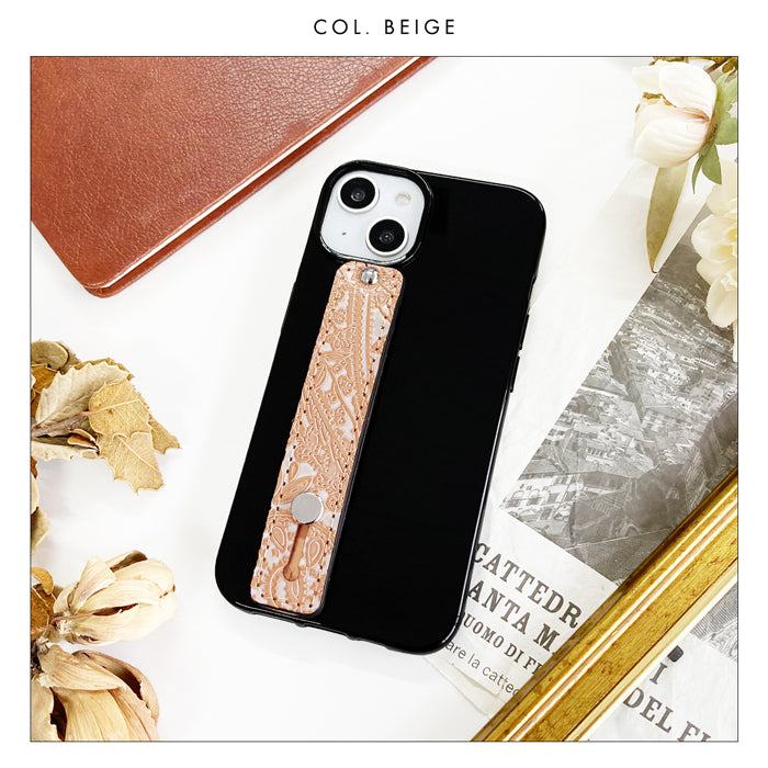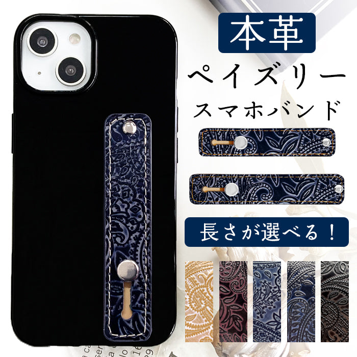指を通して落下防止ベルトとしてお使い頂ける、本革のスマホバンドです。