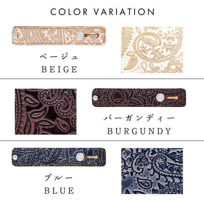 焦げワックスで色の濃淡、ツヤを強調した型押しペイズリー柄となっております。