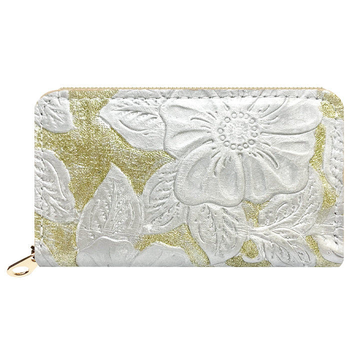 レトロな雰囲気の立体的な花の型押しときらびやかなラメが特徴の本革生地を使用しております。