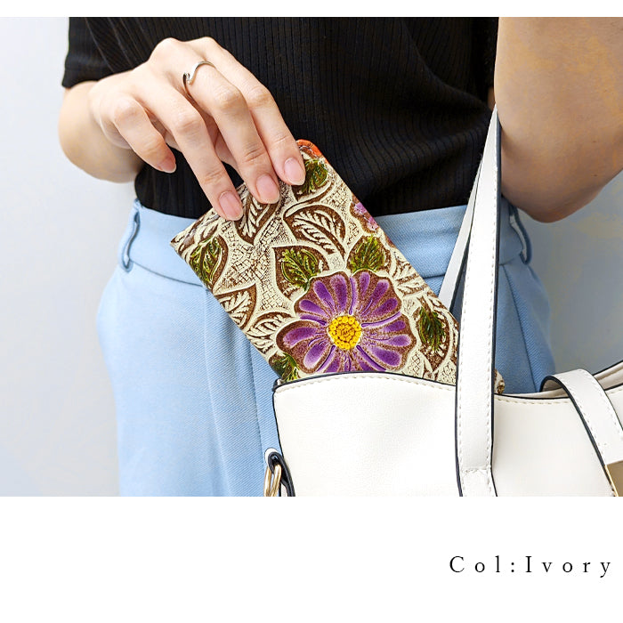【 上品 レトロ 高級 華やか 大人 かわいい 可愛い オシャレ お洒落 レディース 女性 アイボリー イエロー レッド ブルー 紫 黄色 赤 青 フラワー 花 型押し 二つ折り ハンドなし ケース カバー 手帳型 手帳 手帳型ケース 手帳型カバー スマホケース スマホカバー 】