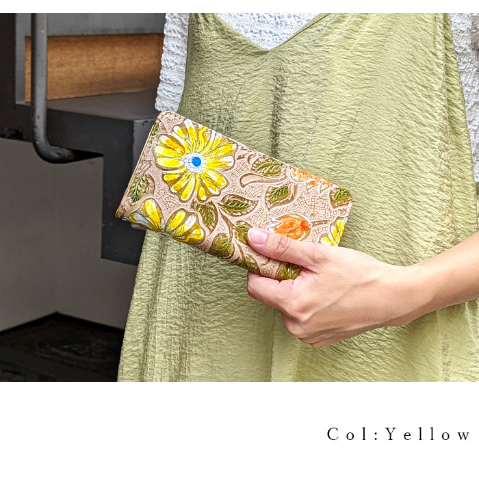 花やリーフの型押しに顔料で色付けをしたレトロチックで女性らしい牛革を使用しております。