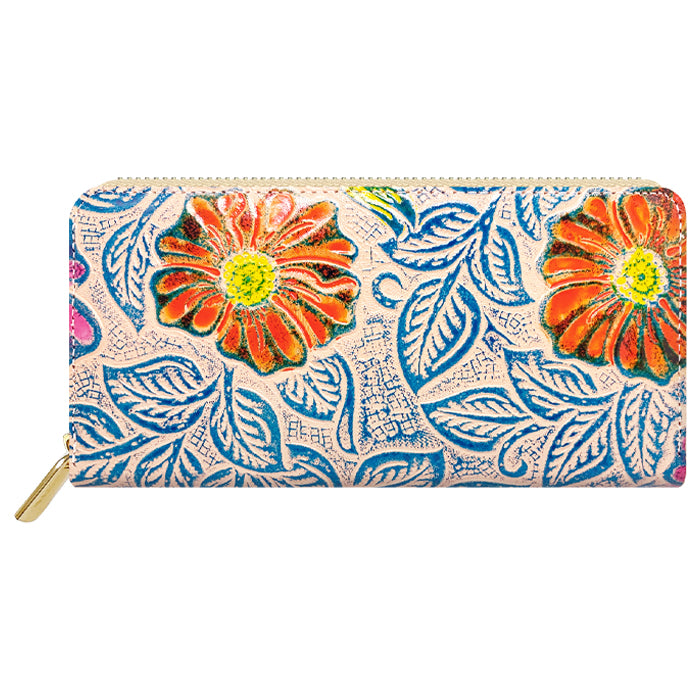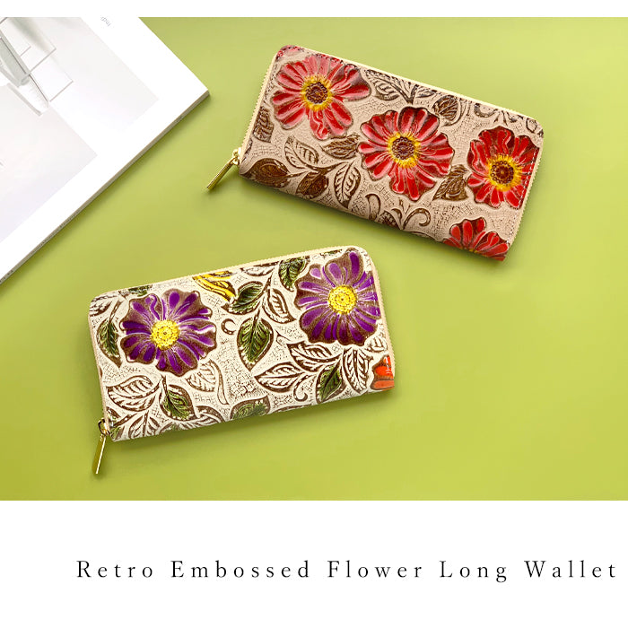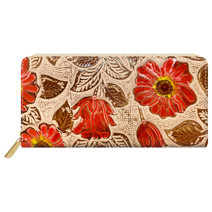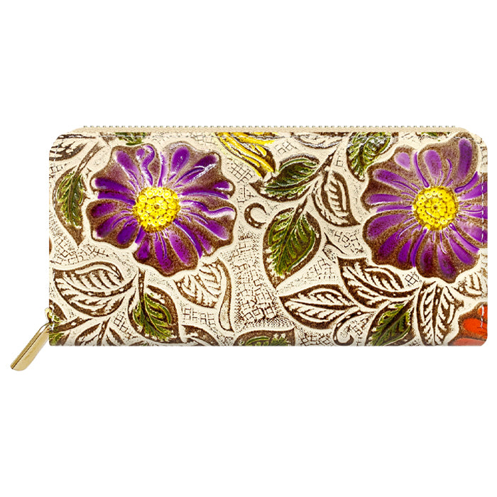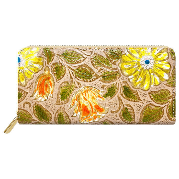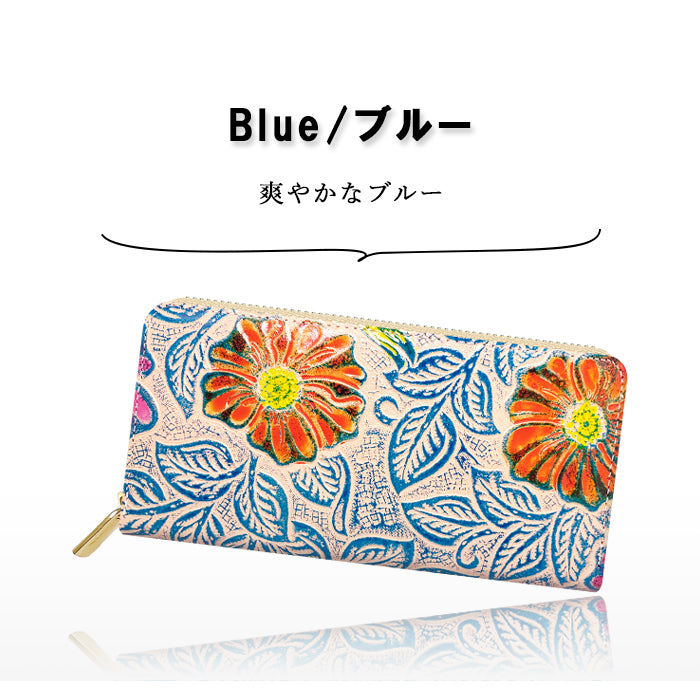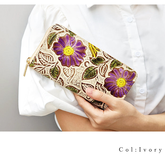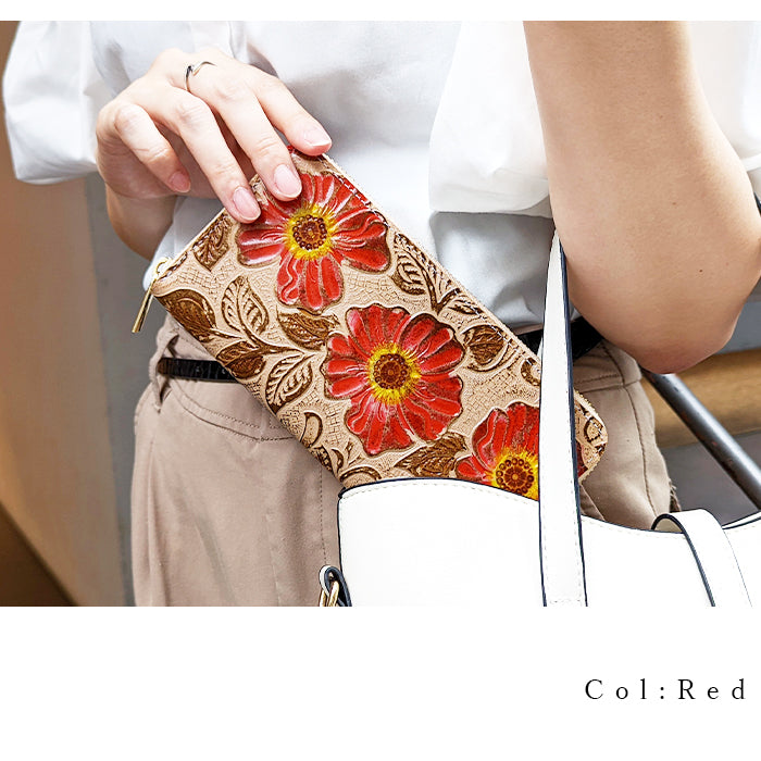 花やリーフの型押しに顔料で色付けをしたレトロチックで女性らしい牛革を使用しております。